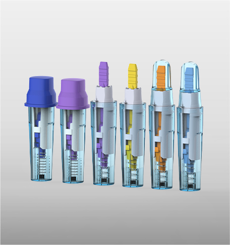 筒形采血筆OneStep型一步裝針,無需卸帽。 筒形采血筆OneStep型專配SoftSense型采血針,不通配市面上其他款式采血針。